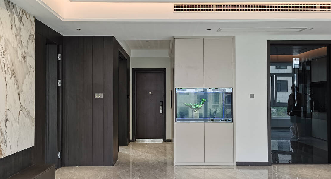 本案整體以現(xiàn)代中式風格為主,既有現(xiàn)代風格簡約、明朗的線條,又有中國傳統(tǒng)內(nèi)涵與韻味。墻面大面積使用暖色烘托整體氛圍,融洽中式與現(xiàn)代簡約兩種風格??臻g更寬闊舒適玄關(guān)收納、玄關(guān)與干區(qū)相結(jié)合,既解放的外衛(wèi)的空間客廳電視背景是一面裝飾柜,豐富了空間,增加了收納和儲物,美觀又實用。