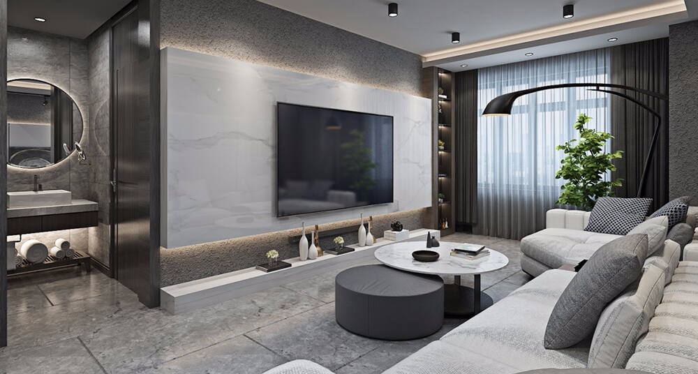 客廳石材懸浮電視墻并帶有上下燈槽,使客廳墻面增添空間感??蛷d的造型墻巧妙地點(diǎn)綴了藝術(shù)品,為整體空間增色不少。地面和墻面選擇了灰色調(diào),以白色軟裝作為對(duì)比,營(yíng)造出立體感,而背景墻的設(shè)計(jì)更是給人一種驚艷的感覺(jué)。臥室的裝飾采用了冷色調(diào),床頭點(diǎn)綴了精致的小吊燈,搭配時(shí)尚的裝飾品和顏色突出的化妝凳。廚房整體采用定制設(shè)計(jì),展現(xiàn)了高端大氣的氛圍。衛(wèi)生間采用了干濕分離的設(shè)計(jì),而異形的鏡子更加突顯了衛(wèi)生間的寬敞感。餐廳選用了圓桌,并搭配藍(lán)色的餐飲點(diǎn)綴,為用餐區(qū)域增添活力。