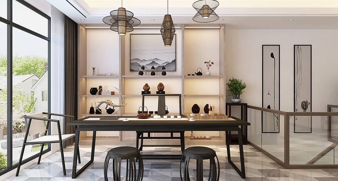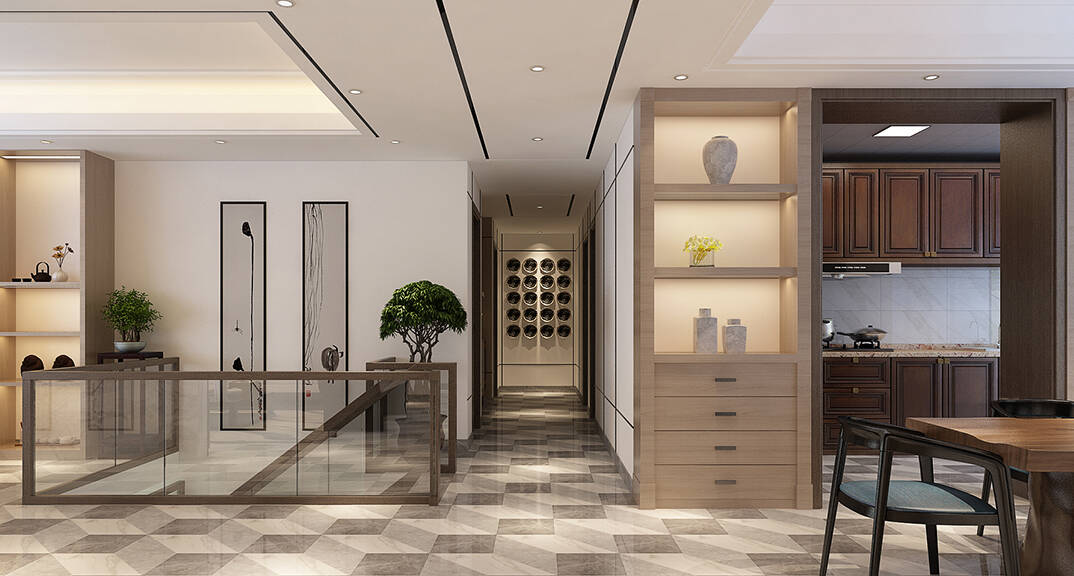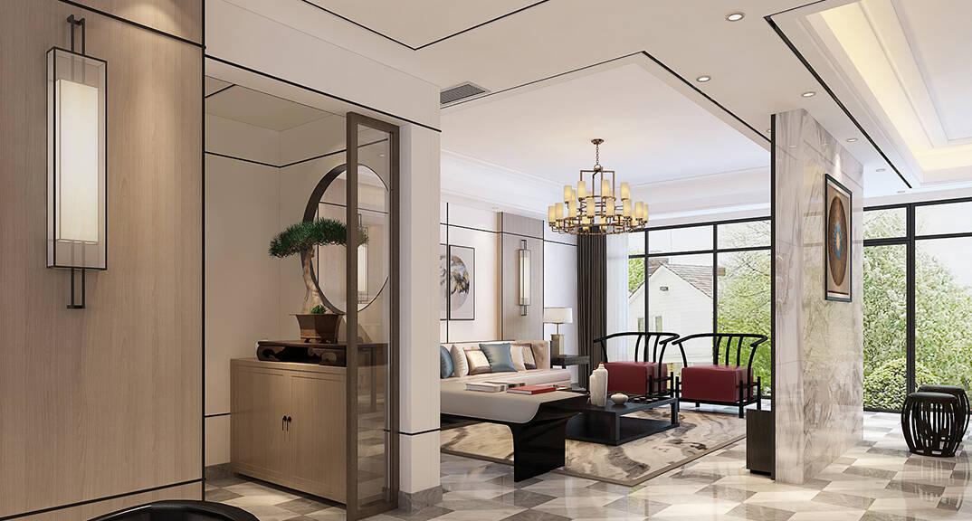 通過(guò)客廳、茶室優(yōu)化空間動(dòng)線,門(mén)廳圓形隱蔽隔斷,天圓地方。地面采用了新中式黑灰白色三基色,體現(xiàn)中式文化中低調(diào)內(nèi)斂的生活方式。