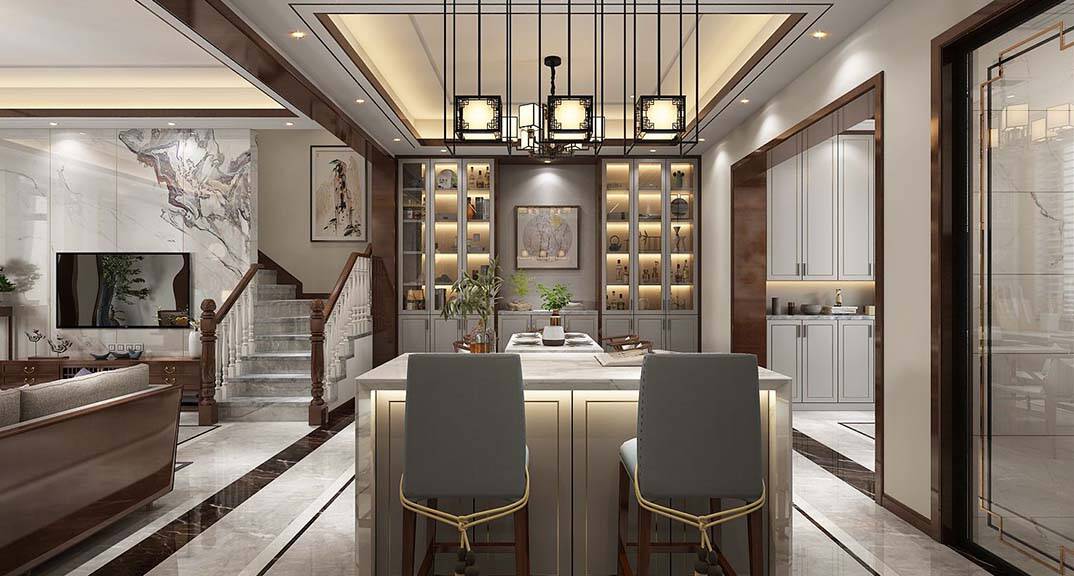 每個家庭的裝修中都需要擁有功能性的設(shè)計,這也是一個家居裝修中最主要的目的。新中式風(fēng)格的設(shè)計理念也體現(xiàn)出了功能性的設(shè)計。比如西餐廳加入大理石島臺的設(shè)計,既體現(xiàn)其視覺上的美感,又具有實用性。