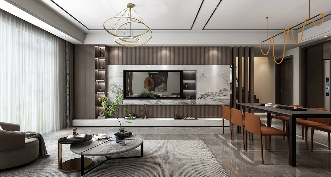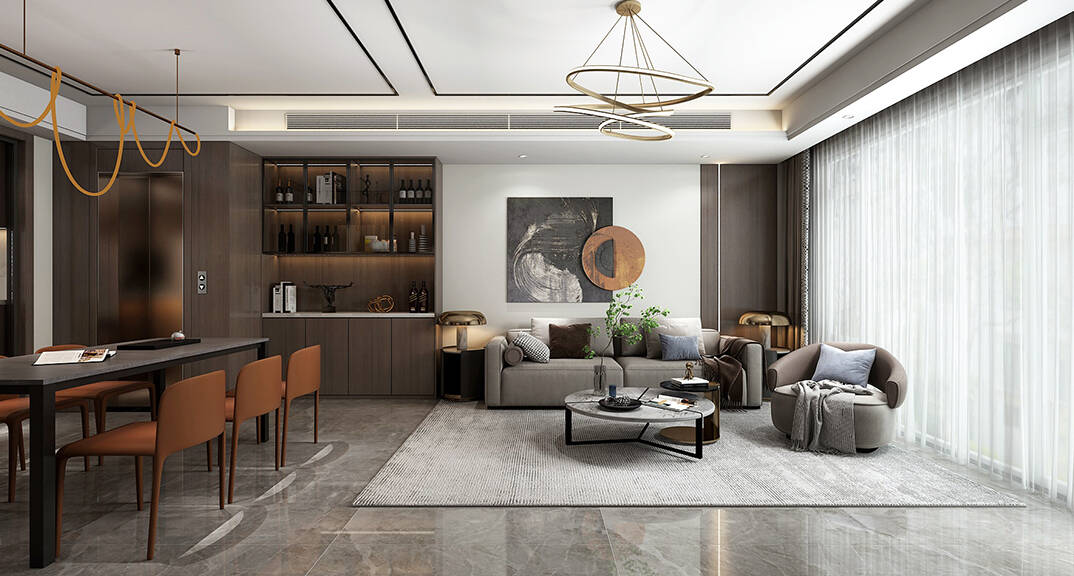 本案設(shè)計(jì)風(fēng)格為意式輕奢,拒絕了濃烈的色彩,以一種簡(jiǎn)單、純粹的設(shè)計(jì)語(yǔ)言,回歸生活的本質(zhì),留存給居住者更多生活想象的空間。 整體空間灰橙色、駝色、與淺暖灰色調(diào)展現(xiàn)輕奢低調(diào)的高級(jí)質(zhì)感,簡(jiǎn)約時(shí)尚的家具又增添了一份現(xiàn)代感,重新梳理了空間功能和尺寸,客廳陽(yáng)臺(tái)一體化設(shè)計(jì),最大限度引入自然光,高級(jí)灰搭配中性色系木飾面,打造一個(gè)舒適的高品質(zhì)空間。在空間設(shè)計(jì)與色彩配搭上,精準(zhǔn)地把控節(jié)奏,用設(shè)計(jì)表達(dá)空間的包容性,更多的是通過人性化思考,創(chuàng)造一個(gè)功能性完整的舒適生活空間。大塊的木飾面、金屬元素和燈 光的碰撞搭配,凸顯出強(qiáng)大張力,共同打造出意式輕奢腔調(diào)十足的時(shí)尚與質(zhì)感。
