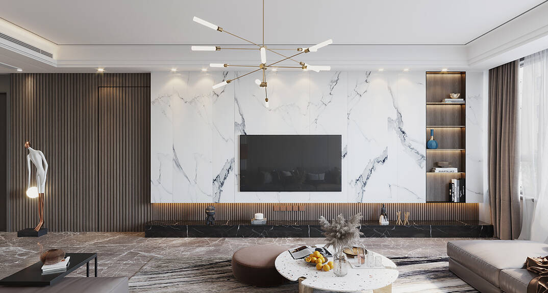日鋼綠城·理想之城217㎡三室兩廳客廳電視現(xiàn)代輕奢風(fēng)格裝修案例效果圖