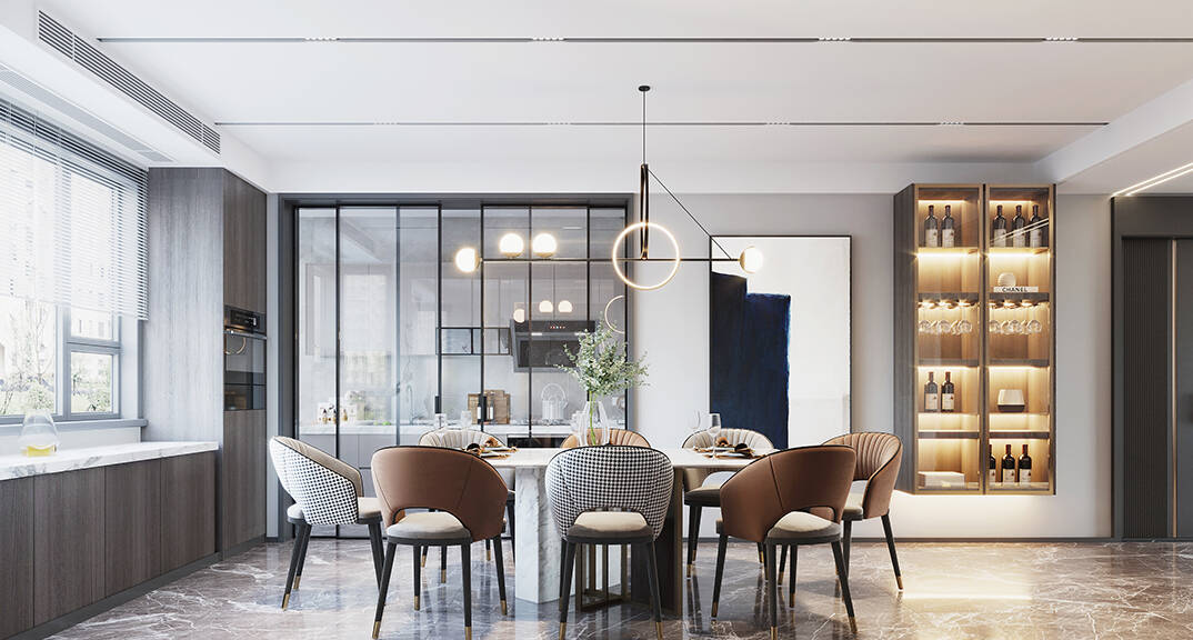 日鋼綠城·理想之城217㎡三室兩廳餐廳現(xiàn)代輕奢風(fēng)格裝修案例效果圖