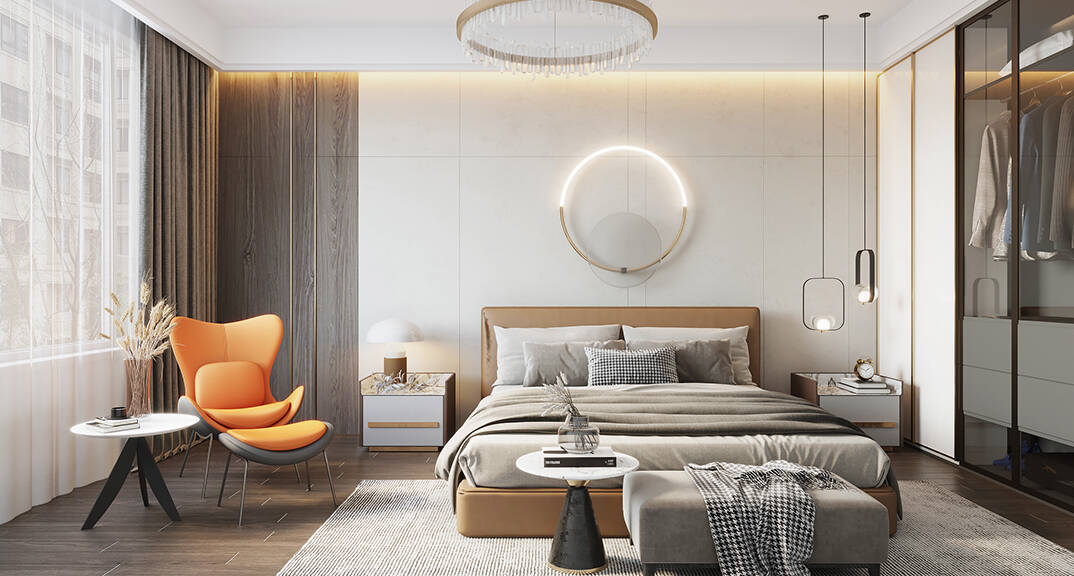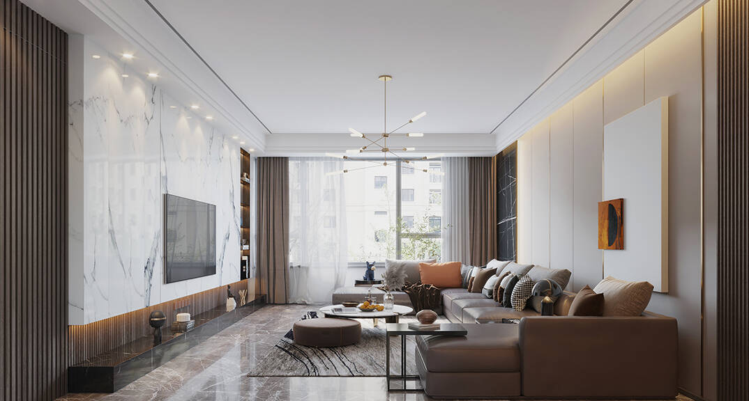本案設(shè)計(jì)風(fēng)格為意式輕奢,拒絕了濃烈的色彩,以一種簡(jiǎn)單、純粹的設(shè)計(jì)語(yǔ)言,回歸生活的本質(zhì),留存給居住者更多生活想象的空間。 整體空間灰橙色、駝色、與淺暖灰色調(diào)展現(xiàn)輕奢低調(diào)的高級(jí)質(zhì)感,簡(jiǎn)約時(shí)尚的家具又增添了一份現(xiàn)代感,重新梳理了空間功能和尺寸,客廳陽(yáng)臺(tái)一體化設(shè)計(jì),最大限度引入自然光,高級(jí)灰搭配中性色系木飾面,打造一個(gè)舒適的高品質(zhì)空間。在空間設(shè)計(jì)與色彩配搭上,精準(zhǔn)地把控節(jié)奏,用設(shè)計(jì)表達(dá)空間的包容性,更多的是通過(guò)人性化思考,創(chuàng)造一個(gè)功能性完整的舒適生活空間。大塊的木飾面、金屬元素和燈 光的碰撞搭配,凸顯出強(qiáng)大張力,共同打造出意式輕奢腔調(diào)十足的時(shí)尚與質(zhì)感。