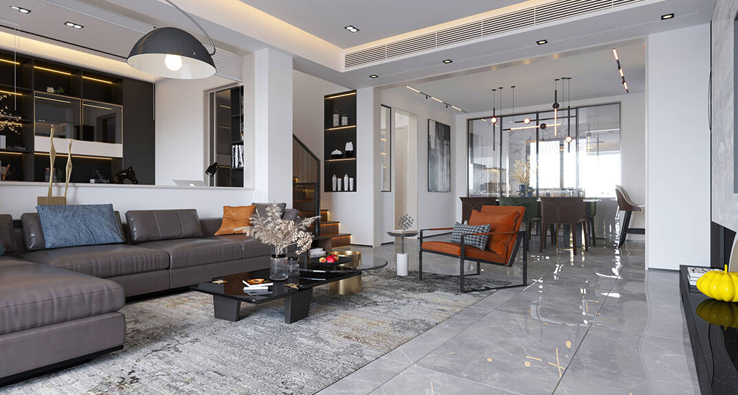 萊頓小鎮(zhèn)·海語(yǔ)墅250㎡別墅下疊一層客廳現(xiàn)代簡(jiǎn)約風(fēng)格裝修案例效果圖