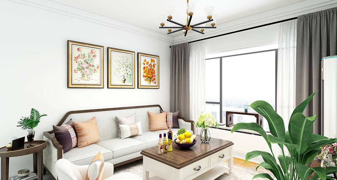 綠地望海領域100㎡三室兩廳客廳沙發(fā)中式風格裝修案例效果圖
