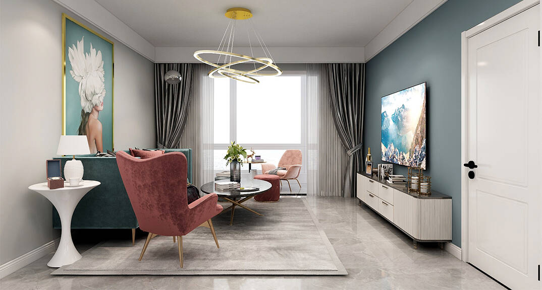 膠州機(jī)場(chǎng)公寓118㎡三室一廳客廳現(xiàn)代風(fēng)格裝修案例效果圖