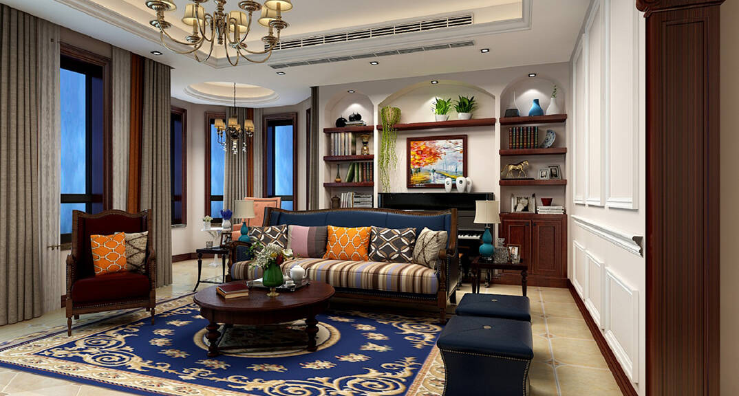 港中旅·海泉灣320㎡別墅客廳美式風(fēng)格裝修案例效果圖