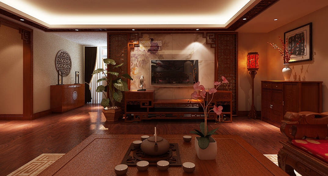 金環(huán)大廈136㎡三室一廳新中式風格客廳電視裝修效果圖