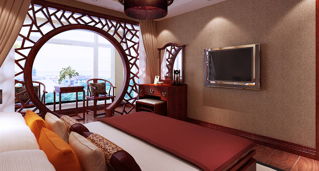 金環(huán)大廈136㎡三室一廳新中式風格臥室客廳裝修效果圖
