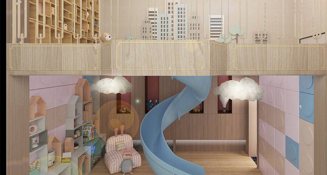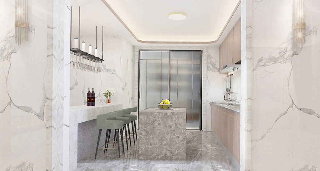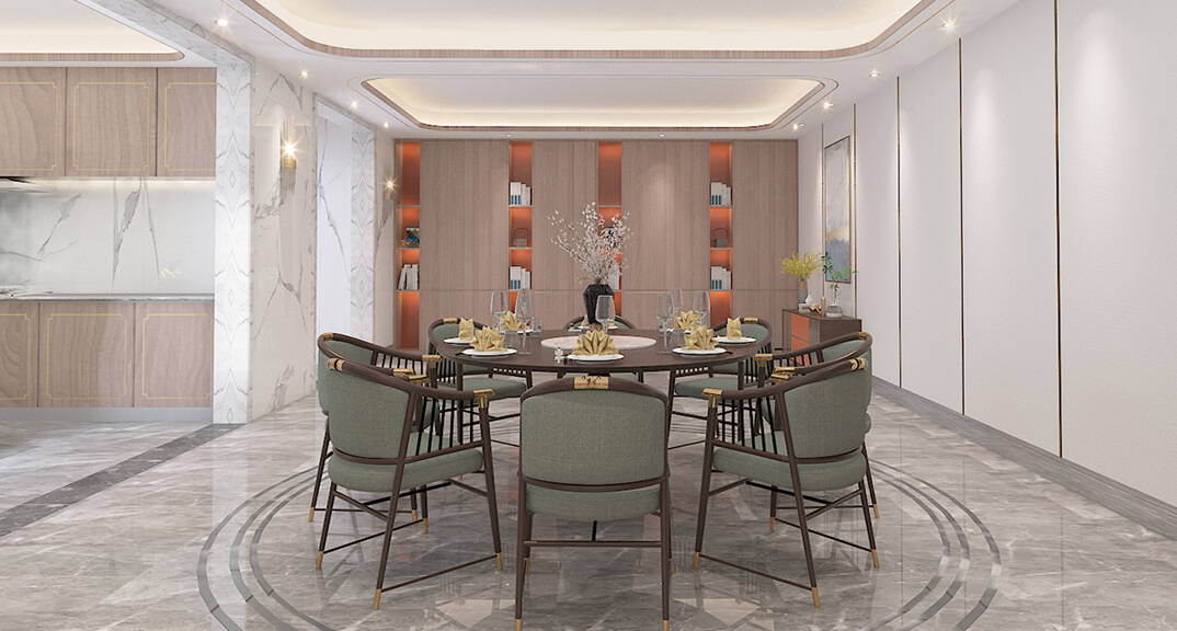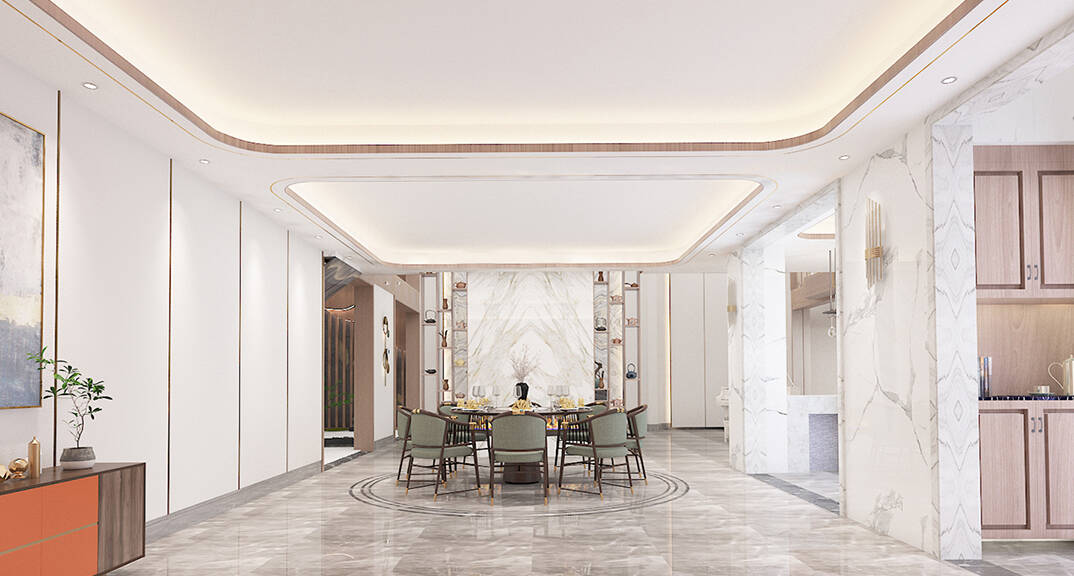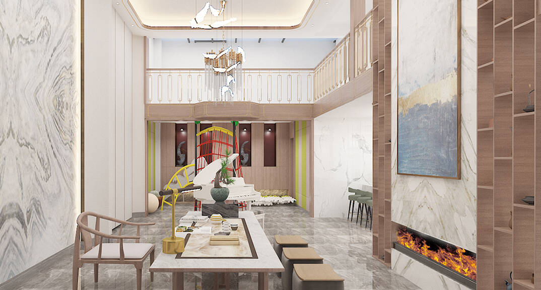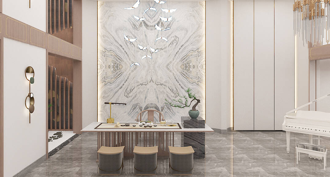 整體風(fēng)格為新中式風(fēng)格,因功能主要為會(huì)客用。所以設(shè)計(jì)時(shí)很多地方運(yùn)用迎客松,為迎接客人。全屋采用大理石上墻,簡(jiǎn)單大氣。入戶玄關(guān)采用歐式吊頂及窗臺(tái)以及鞋帽柜,入戶正對(duì)玄關(guān)柜,迎接客人。餐廳裝飾柜背板顏色和玄關(guān)柜顏色相互呼應(yīng)。酒窖外面即為開放式廚房并搭配吧臺(tái),使客人更愜意的品嘗紅酒及交談。閑暇時(shí)刻還可以在茶室喝茶或討論工作。并且家里的小朋友可以練習(xí)彈鋼琴,休息時(shí)同時(shí)有休閑區(qū)和滑梯放松一下。