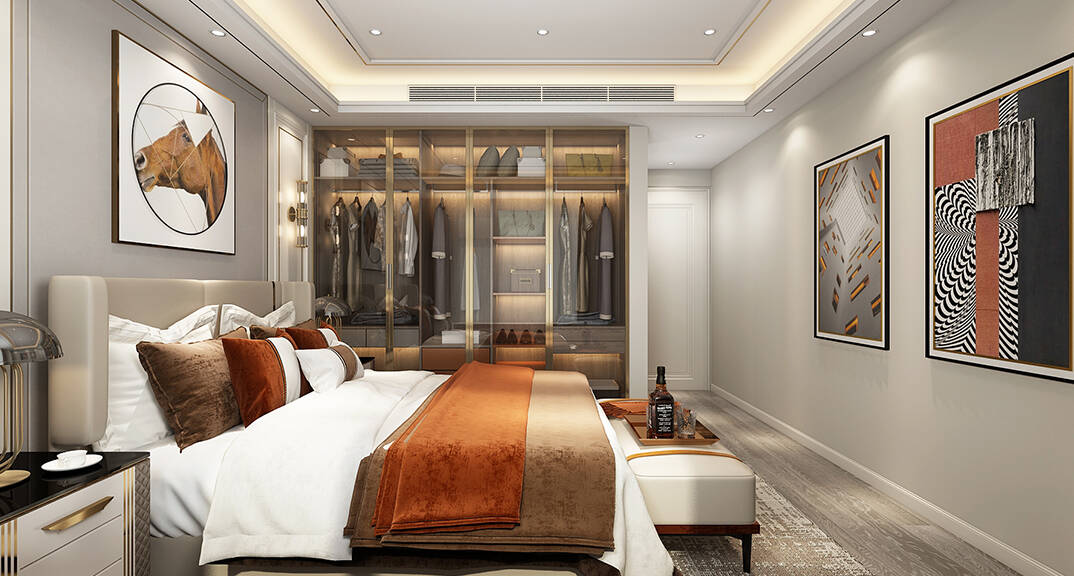本案設計風格為意式輕奢,拒絕了濃烈的色彩,以一種簡單、純粹的設計語言,回歸生活的本質,留存給居住者更多生活想象的空間。 整體空間灰橙色、駝色、與淺暖灰色調展現輕奢低調的高級質感,簡約時尚的家具又增添了一份現代感,重新梳理了空間功能和尺寸,客廳陽臺一體化設計,最大限度引入自然光,高級灰搭配中性色系木飾面,打造一個舒適的高品質空間。在空間設計與色彩配搭上,精準地把控節(jié)奏,用設計表達空間的包容性,更多的是通過人性化思考,創(chuàng)造一個功能性完整的舒適生活空間。大塊的木飾面、金屬元素和燈 光的碰撞搭配,凸顯出強大張力,共同打造出意式輕奢腔調十足的時尚與質感。