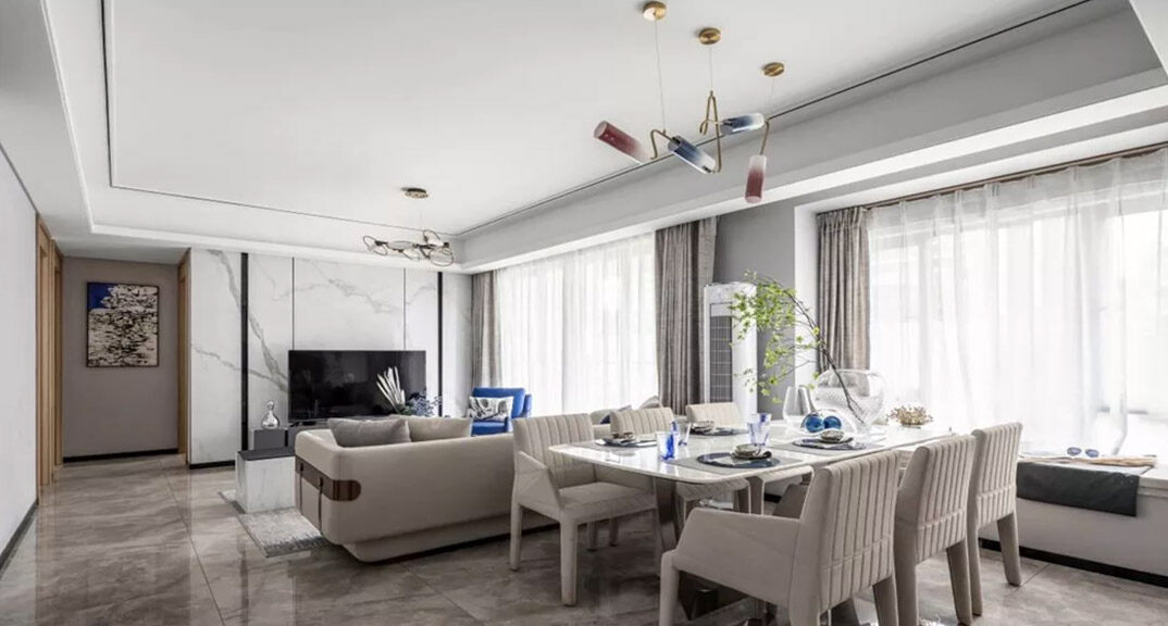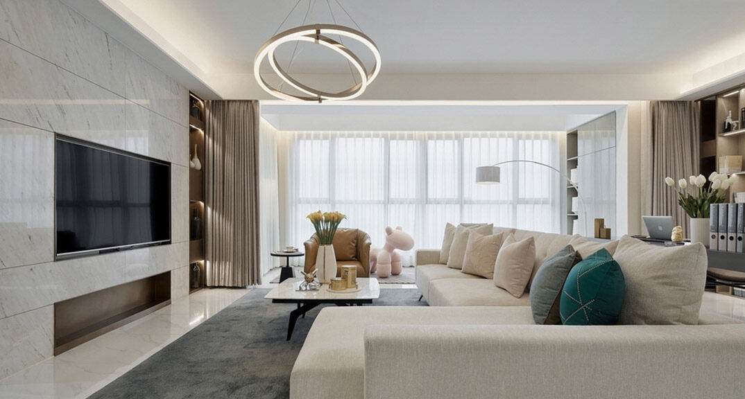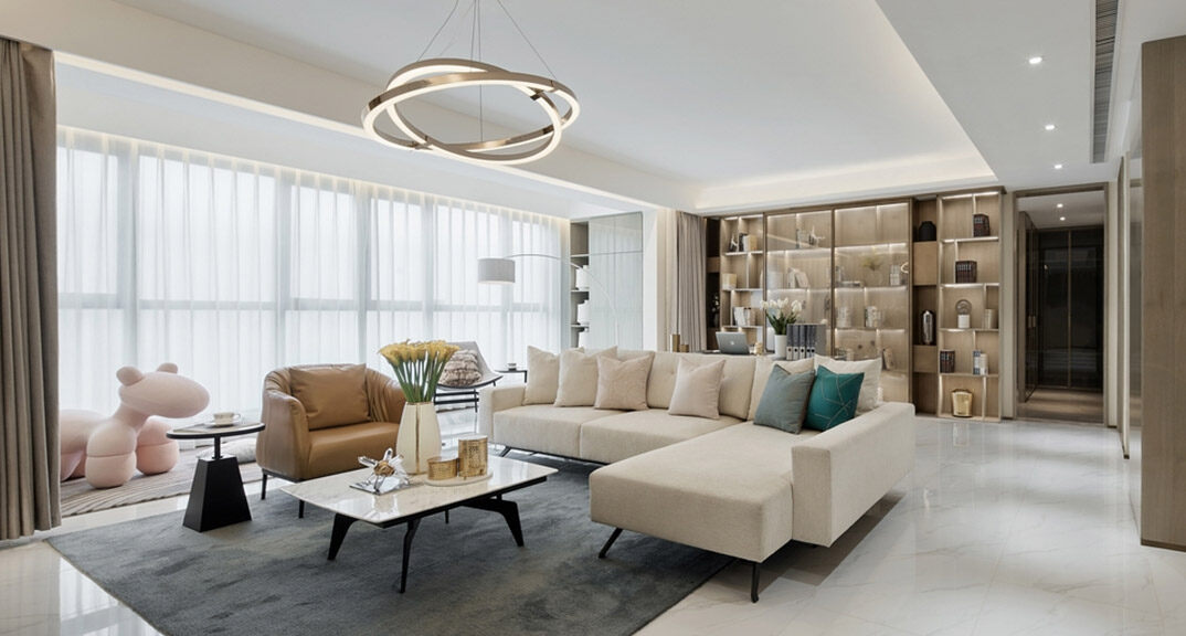 天一仁和瓏樾海125㎡別墅上疊客廳現(xiàn)代輕奢風(fēng)格裝修研發(fā)效果圖