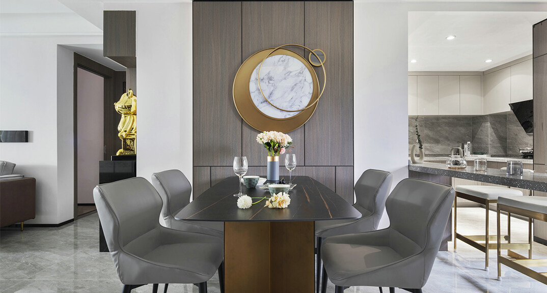 輕奢風格的空間以金屬、皮革的中性色調(diào)為主,用色彩的純度傳遞細膩的質(zhì)感。在視覺上舍棄張揚,通過對線條與色塊的巧妙應(yīng)用,營造出輕松的空間氛圍,傳遞“輕奢華、新時尚”的生活理念。造型簡潔,線條流暢的家具組合搭配,營造出穩(wěn)定、協(xié)調(diào)、溫馨的空間感受,滿足現(xiàn)代年輕家庭的輕奢需求。