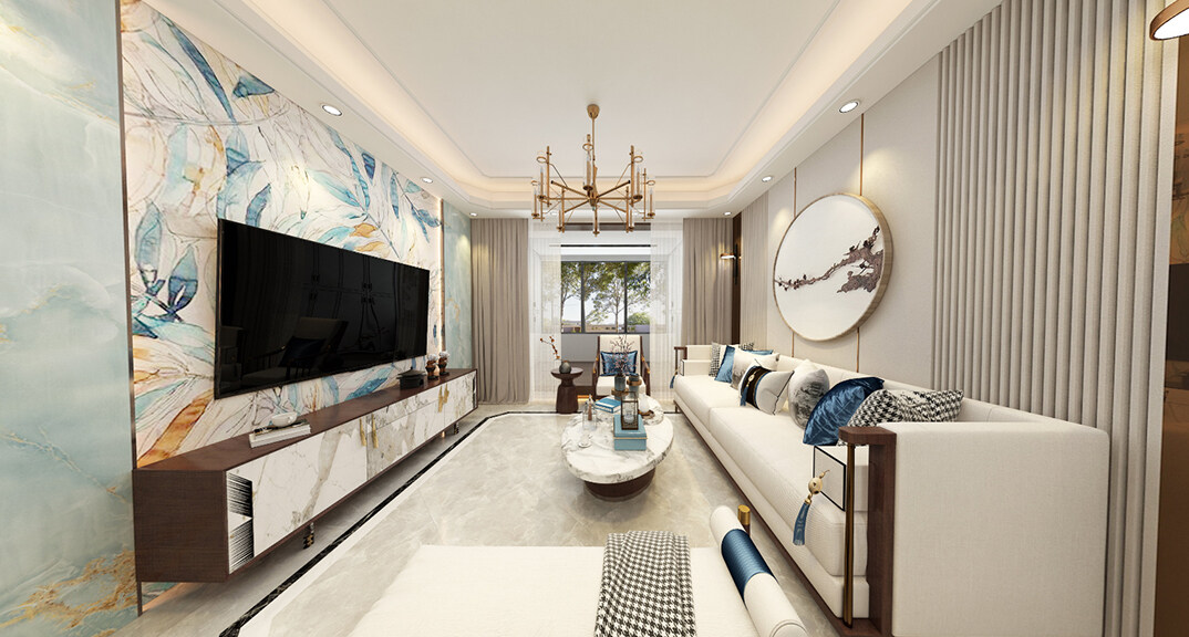 青安·海悅居86㎡二室二廳客廳新中式風(fēng)格裝修案例效果圖