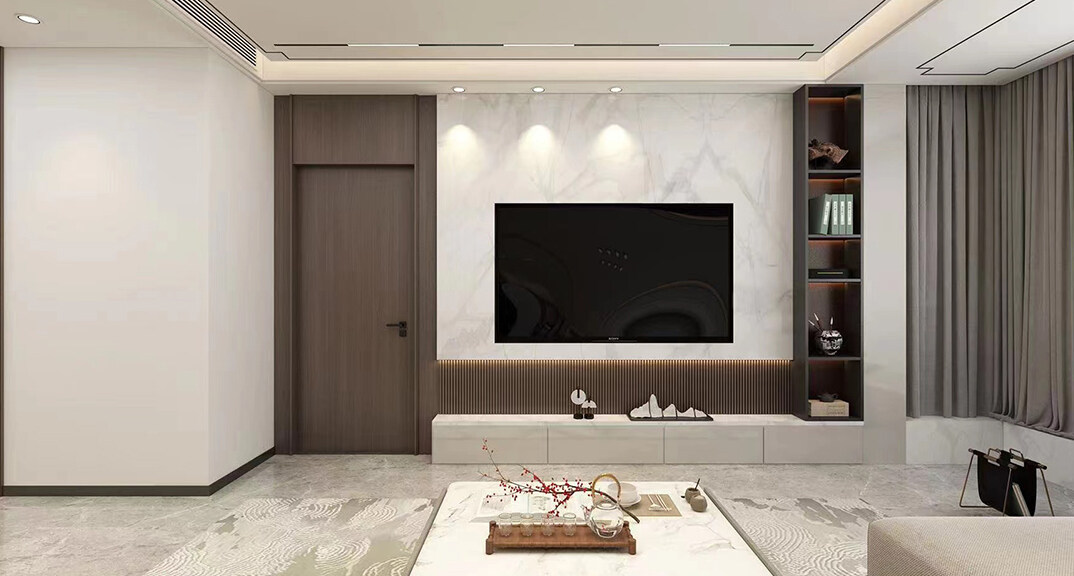 海信·依云小鎮(zhèn)135㎡三室一廳客廳電視新中式風(fēng)格裝修案例效果圖