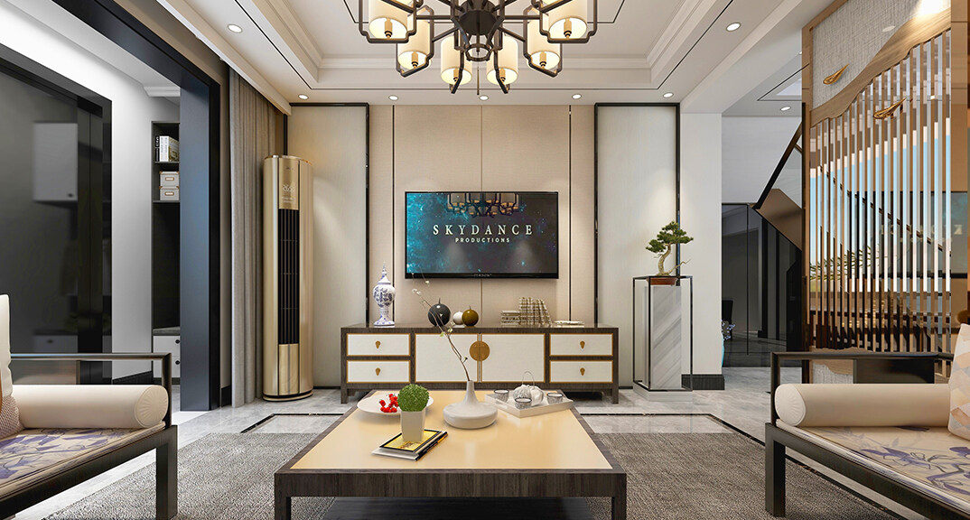 楓林小鎮(zhèn)160㎡聯(lián)排別墅客廳新中式風格裝修案例效果圖