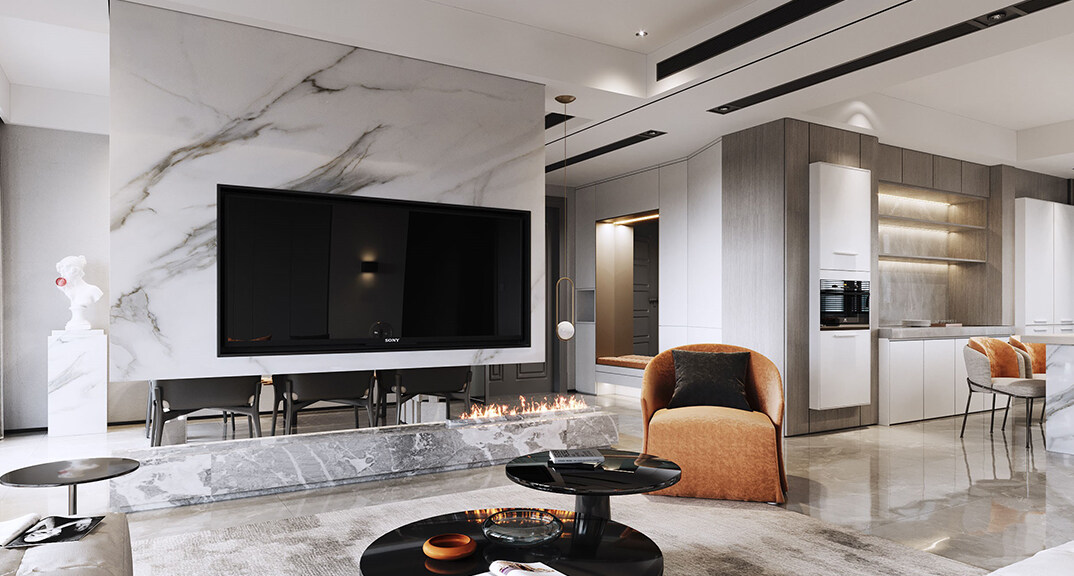 本案設(shè)計(jì)風(fēng)格為意式輕奢,拒絕了濃烈的色彩,以一種簡(jiǎn)單、純粹的設(shè)計(jì)語(yǔ)言,回歸生活的本質(zhì),留存給居住者更多生活想象的空間。 整體空間灰橙色、駝色、與淺暖灰色調(diào)展現(xiàn)輕奢低調(diào)的高級(jí)質(zhì)感,簡(jiǎn)約時(shí)尚的家具又增添了一份現(xiàn)代感,重新梳理了空間功能和尺寸,客廳陽(yáng)臺(tái)一體化設(shè)計(jì),最大限度引入自然光,高級(jí)灰搭配中性色系木飾面,打造一個(gè)舒適的高品質(zhì)空間。在空間設(shè)計(jì)與色彩配搭上,精準(zhǔn)地把控節(jié)奏,用設(shè)計(jì)表達(dá)空間的包容性,更多的是通過(guò)人性化思考,創(chuàng)造一個(gè)功能性完整的舒適生活空間。大塊的木飾面、金屬元素和燈 光的碰撞搭配,凸顯出強(qiáng)大張力,共同打造出意式輕奢腔調(diào)十足的時(shí)尚與質(zhì)感。