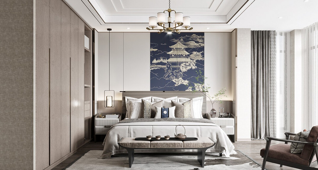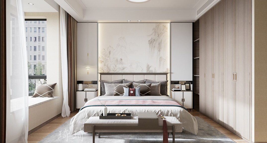 魯商藍(lán)岸公館126㎡三室二廳主臥現(xiàn)代中式裝修案例效果圖