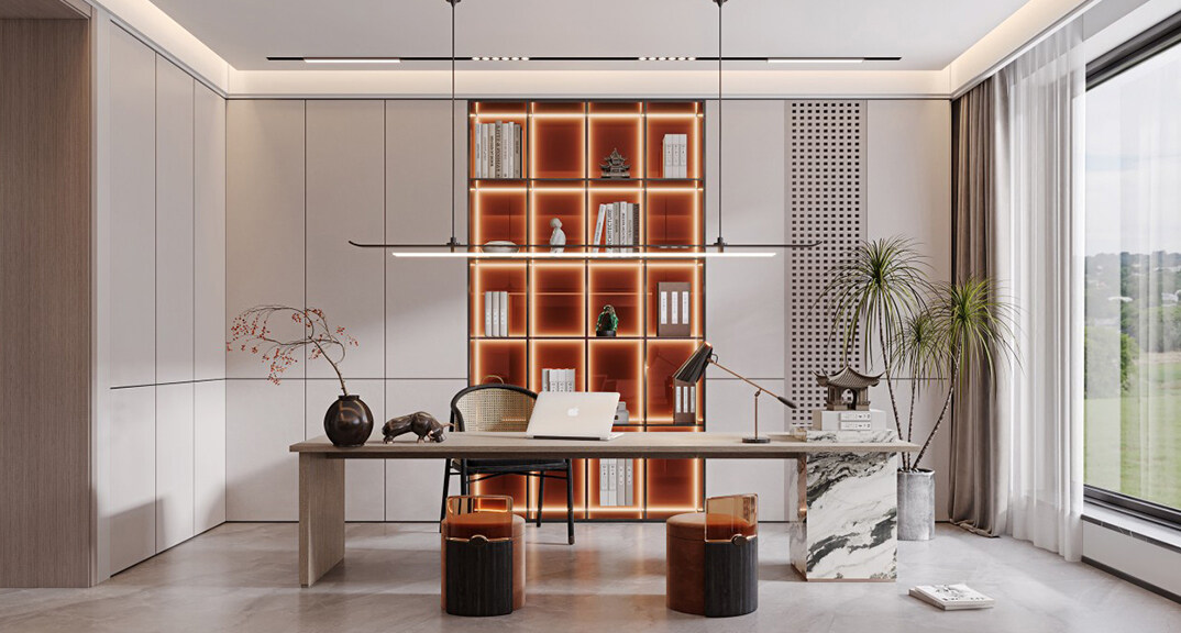 魯商藍(lán)岸公館126㎡三室二廳書(shū)房現(xiàn)代中式裝修案例效果圖