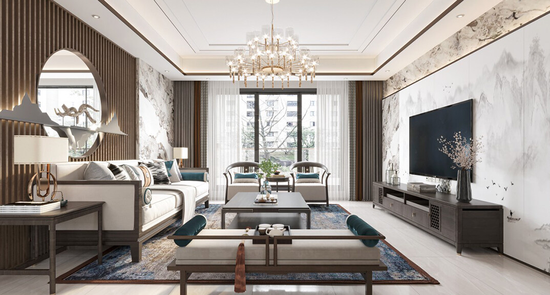 魯商藍(lán)岸公館126㎡三室二廳客廳現(xiàn)代中式裝修案例效果圖