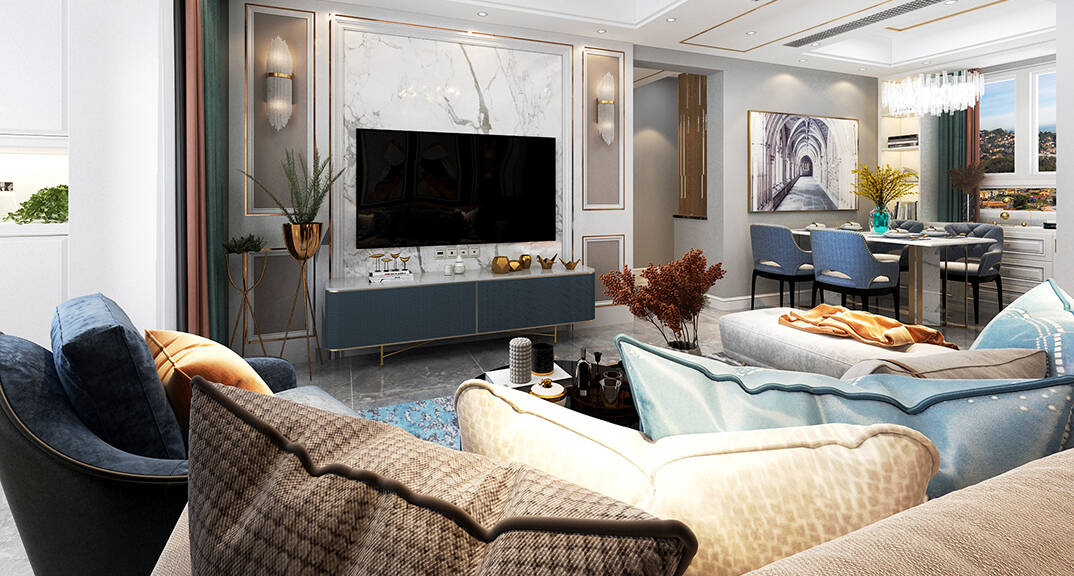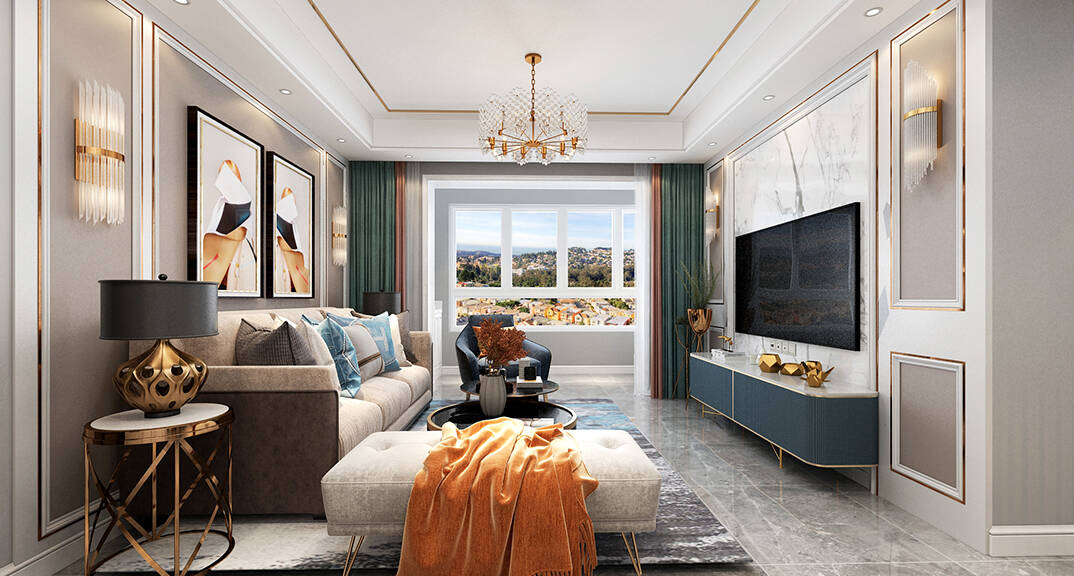 海爾產(chǎn)城創(chuàng)悅湖蘭庭116m2客廳輕奢風(fēng)格裝修案例效果圖