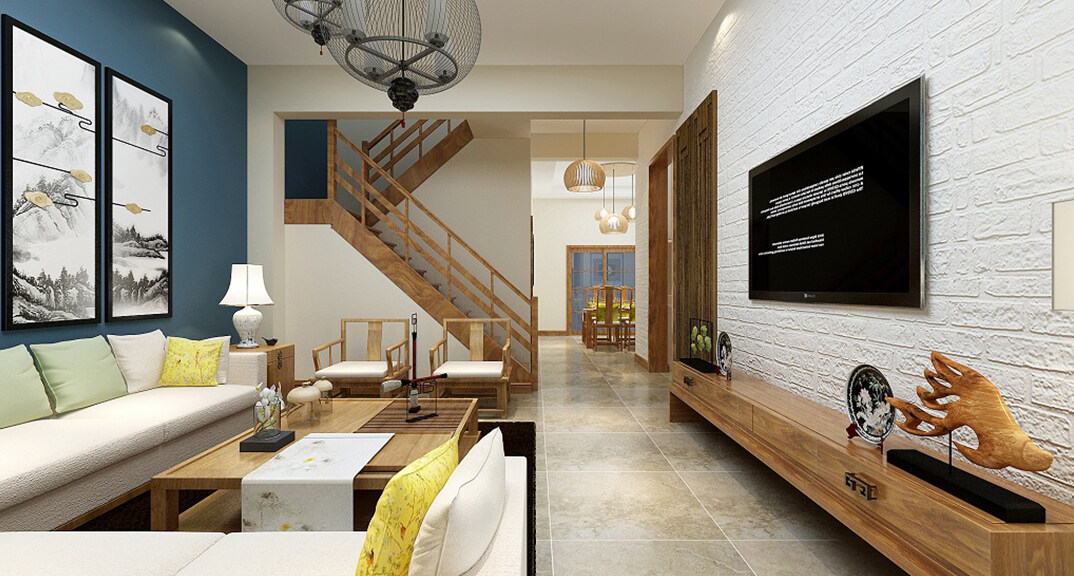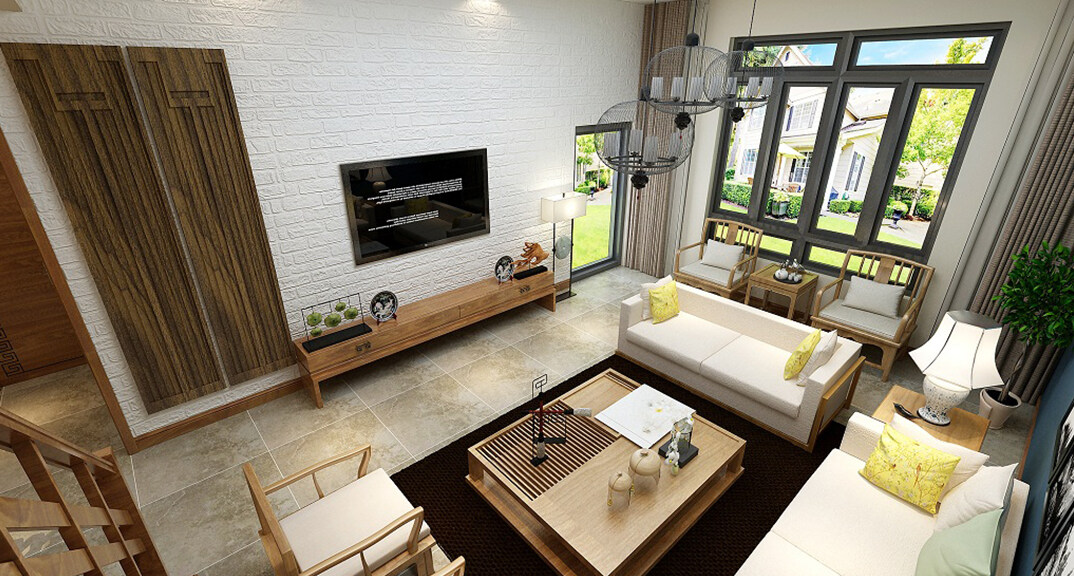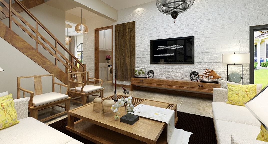安納溪220㎡獨棟別墅客廳電視新中式風(fēng)格裝修案例效果圖
