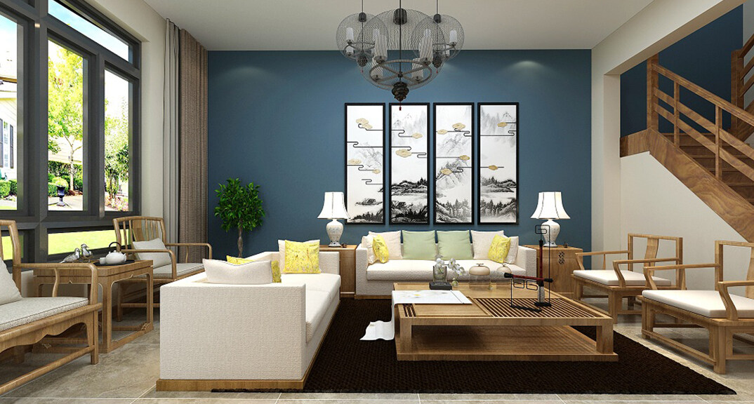 安納溪220㎡獨棟別墅客廳沙發(fā)新中式風(fēng)格裝修案例效果圖