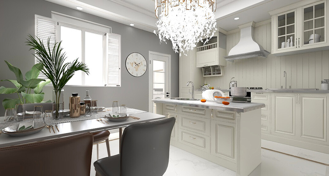 恒大金沙灘100㎡兩室兩廳餐廳廚房歐式輕奢風(fēng)格裝修案例效果圖