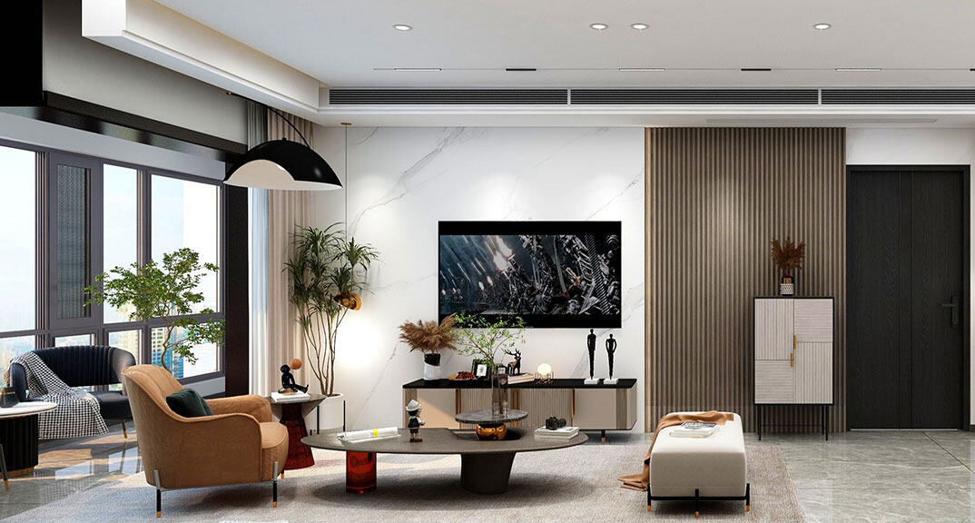 越秀鉑悅府132㎡三室兩廳客廳現(xiàn)代輕奢風(fēng)格裝修案例效果圖