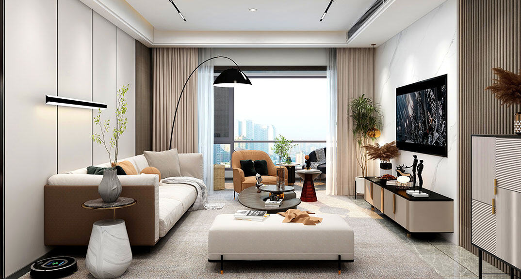 以現(xiàn)代風(fēng)格為主調(diào),主要色彩是米色、淺咖色、白色。在總體布局方面滿足寬敞明亮的需求,注重居室空間的布局與使用功能的完美結(jié)合。整體簡約又不失設(shè)計感,開放式布局空間聯(lián)通,動線流暢。客廳米灰色系的沙發(fā),造型簡約,搭配材質(zhì)柔軟的軟裝,使客廳充滿閑話自在的空間氛圍。