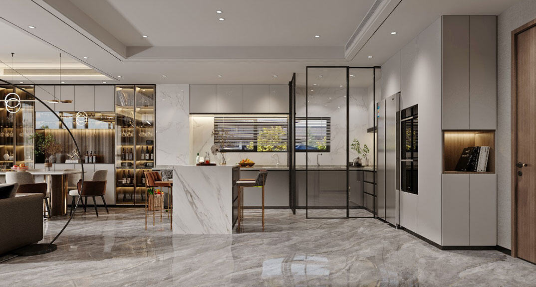 青島小鎮(zhèn)175㎡別墅下疊廚房輕奢極簡風格裝修案例效果圖