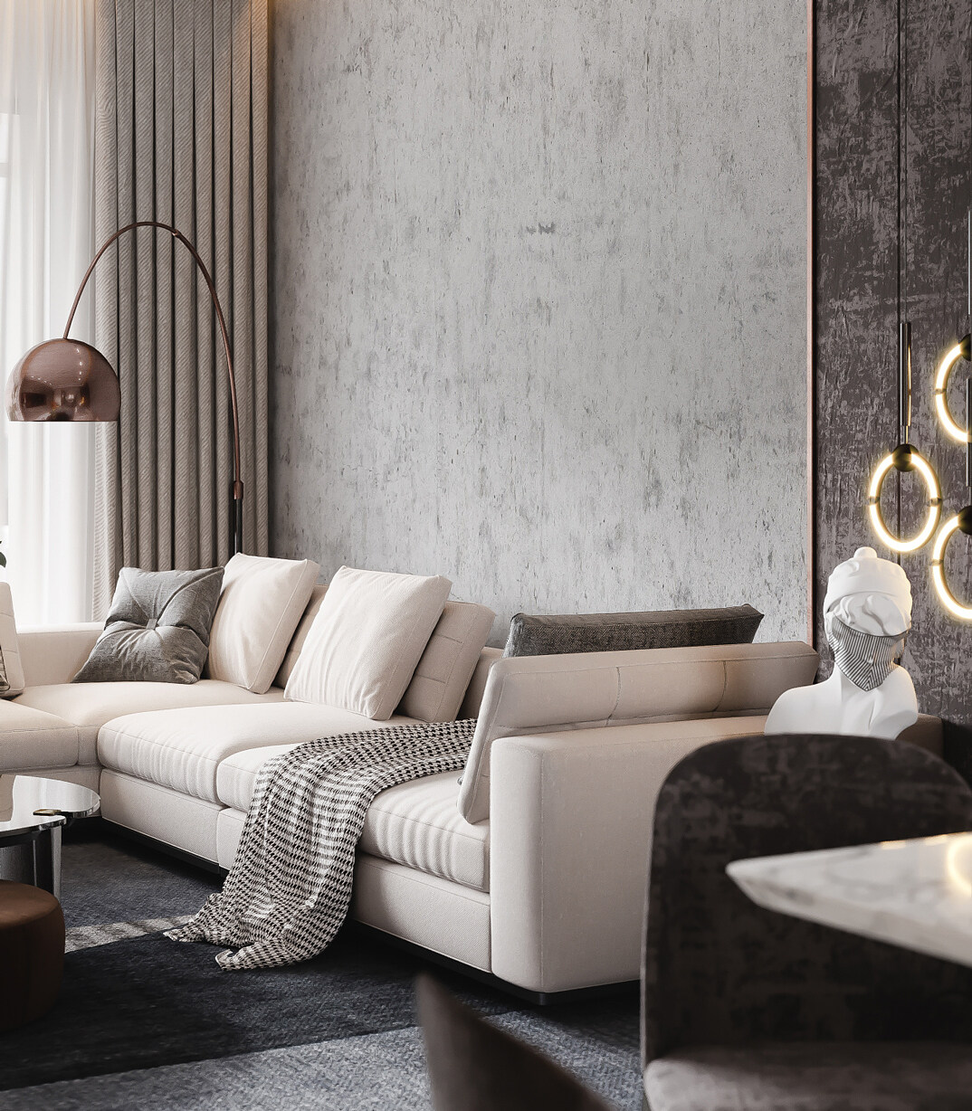 本案設(shè)計(jì)風(fēng)格為意式輕奢,拒絕了濃烈的色彩,以一種簡(jiǎn)單、純粹的設(shè)計(jì)語言,回歸生活的本質(zhì),留存給居住者更多生活想象的空間。 整體空間灰橙色、駝色、與淺暖灰色調(diào)展現(xiàn)輕奢低調(diào)的高級(jí)質(zhì)感,簡(jiǎn)約時(shí)尚的家具又增添了一份現(xiàn)代感,重新梳理了空間功能和尺寸,客廳陽臺(tái)一體化設(shè)計(jì),最大限度引入自然光,高級(jí)灰搭配中性色系木飾面,打造一個(gè)舒適的高品質(zhì)空間。在空間設(shè)計(jì)與色彩配搭上,精準(zhǔn)地把控節(jié)奏,用設(shè)計(jì)表達(dá)空間的包容性,更多的是通過人性化思考,創(chuàng)造一個(gè)功能性完整的舒適生活空間。大塊的木飾面、金屬元素和燈 光的碰撞搭配,凸顯出強(qiáng)大張力,共同打造出意式輕奢腔調(diào)十足的時(shí)尚與質(zhì)感。
