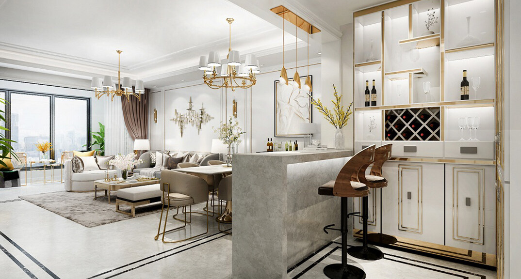 和達(dá)璟城128㎡洋房別墅客餐廳吧臺(tái)輕奢風(fēng)格裝修案例效果圖