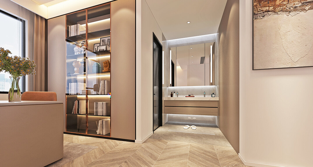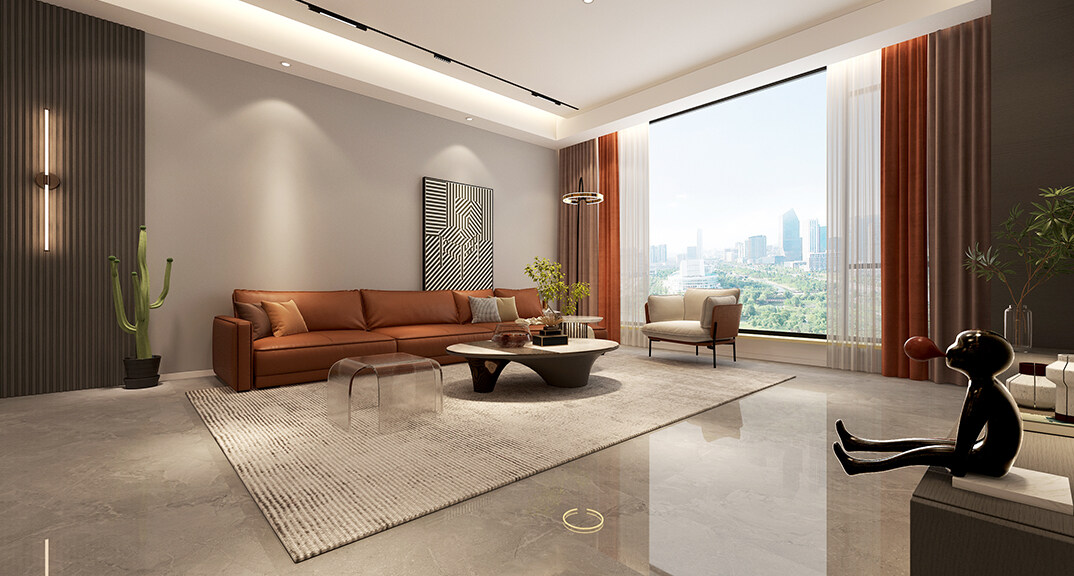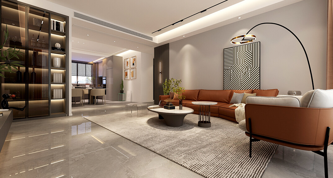 本案設(shè)計風格為意式輕奢,拒絕了濃烈的色彩,以一種簡單、純粹的設(shè)計語言,回歸生活的本質(zhì),留存給居住者更多生活想象的空間。 整體空間灰橙色、駝色、與淺暖灰色調(diào)展現(xiàn)輕奢低調(diào)的高級質(zhì)感,簡約時尚的家具又增添了一份現(xiàn)代感,重新梳理了空間功能和尺寸,客廳陽臺一體化設(shè)計,最大限度引入自然光,高級灰搭配中性色系木飾面,打造一個舒適的高品質(zhì)空間。在空間設(shè)計與色彩配搭上,精準地把控節(jié)奏,用設(shè)計表達空間的包容性,更多的是通過人性化思考,創(chuàng)造一個功能性完整的舒適生活空間。大塊的木飾面、金屬元素和燈 光的碰撞搭配,凸顯出強大張力,共同打造出意式輕奢腔調(diào)十足的時尚與質(zhì)感。