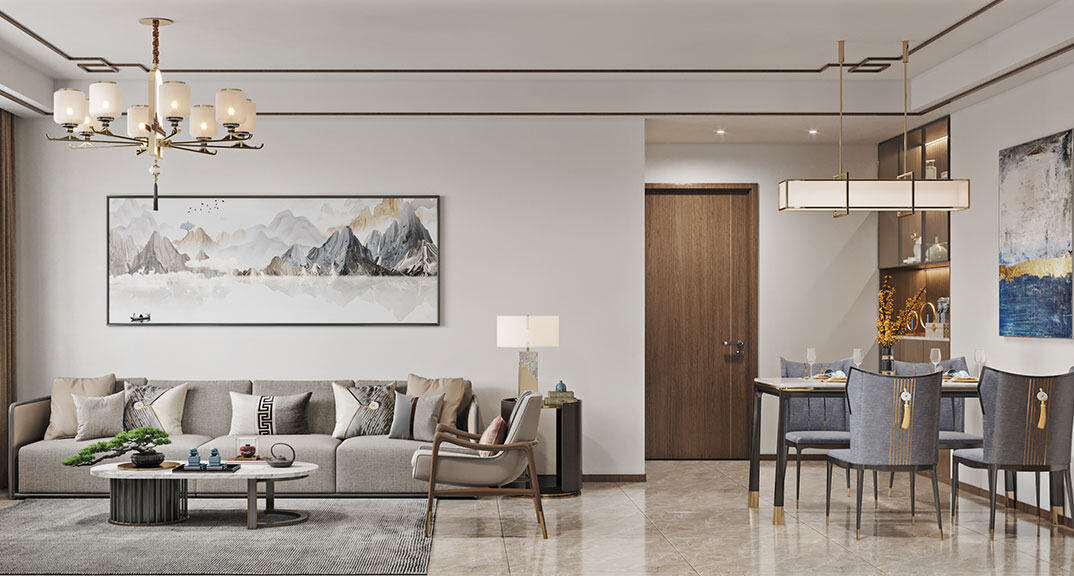 魯商藍岸公館125㎡三室兩廳客餐廳新中式風(fēng)格裝修案例效果圖