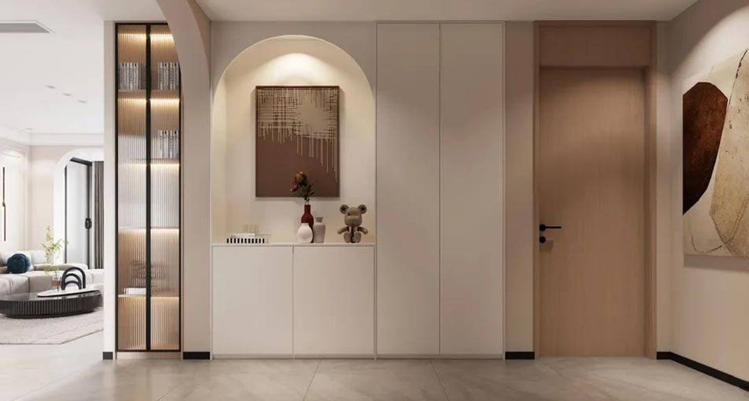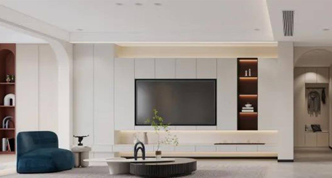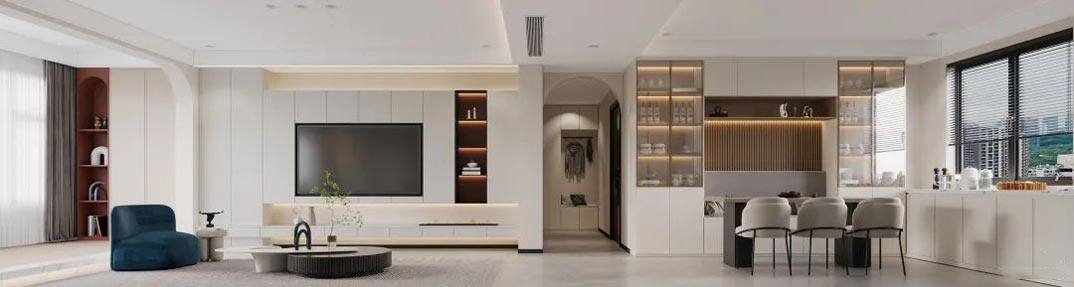 本案整體以現(xiàn)代中式風(fēng)格為主,既有現(xiàn)代風(fēng)格簡約、明朗的線條,又有中國傳統(tǒng)內(nèi)涵與韻味。墻面大面積使用暖色烘托整體氛圍,融洽中式與現(xiàn)代簡約兩種風(fēng)格。空間更寬闊舒適玄關(guān)收納、玄關(guān)與干區(qū)相結(jié)合,既解放的外衛(wèi)的空間客廳電視背景是一面裝飾柜,豐富了空間,增加了收納和儲物,美觀又實(shí)用。
