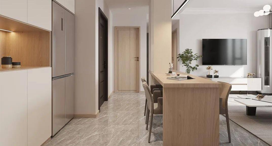 以簡潔、清晰和功能性為特征的室內(nèi)設(shè)計(jì);它主要強(qiáng)調(diào)了空間的簡化和精煉,追求線條簡單、空間通透、色彩明亮、材質(zhì)自然等特點(diǎn),注重形式與功能的結(jié)合。他們希望有一個(gè)時(shí)尚、現(xiàn)代的功能性空間,在整個(gè)空間的設(shè)計(jì)上用了暖灰調(diào)來與簡約的線條感來相呼應(yīng),能改造出一個(gè)通透、流暢的空間感。