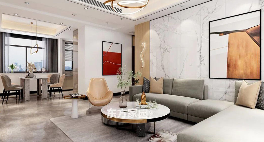 本案設(shè)計(jì)風(fēng)格為意式輕奢,拒絕了濃烈的色彩,以一種簡(jiǎn)單、純粹的設(shè)計(jì)語(yǔ)言,回歸生活的本質(zhì),留存給居住者更多生活想象的空間。 整體空間灰橙色、駝色、與淺暖灰色調(diào)展現(xiàn)輕奢低調(diào)的高級(jí)質(zhì)感,簡(jiǎn)約時(shí)尚的家具又增添了一份現(xiàn)代感,重新梳理了空間功能和尺寸,客廳陽(yáng)臺(tái)一體化設(shè)計(jì),最大限度引入自然光,高級(jí)灰搭配中性色系木飾面,打造一個(gè)舒適的高品質(zhì)空間。在空間設(shè)計(jì)與色彩配搭上,精準(zhǔn)地把控節(jié)奏,用設(shè)計(jì)表達(dá)空間的包容性,更多的是通過人性化思考,創(chuàng)造一個(gè)功能性完整的舒適生活空間。大塊的木飾面、金屬元素和燈 光的碰撞搭配,凸顯出強(qiáng)大張力,共同打造出意式輕奢腔調(diào)十足的時(shí)尚與質(zhì)感。