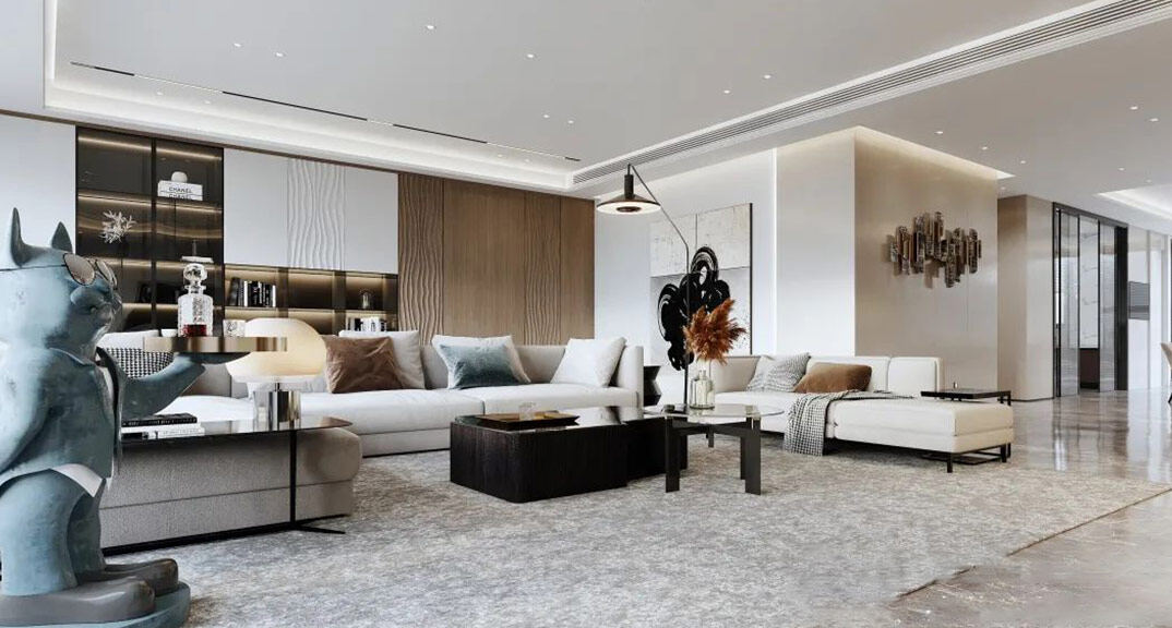 日鋼綠城300㎡別墅客廳現(xiàn)代輕奢風格裝修案例效果圖