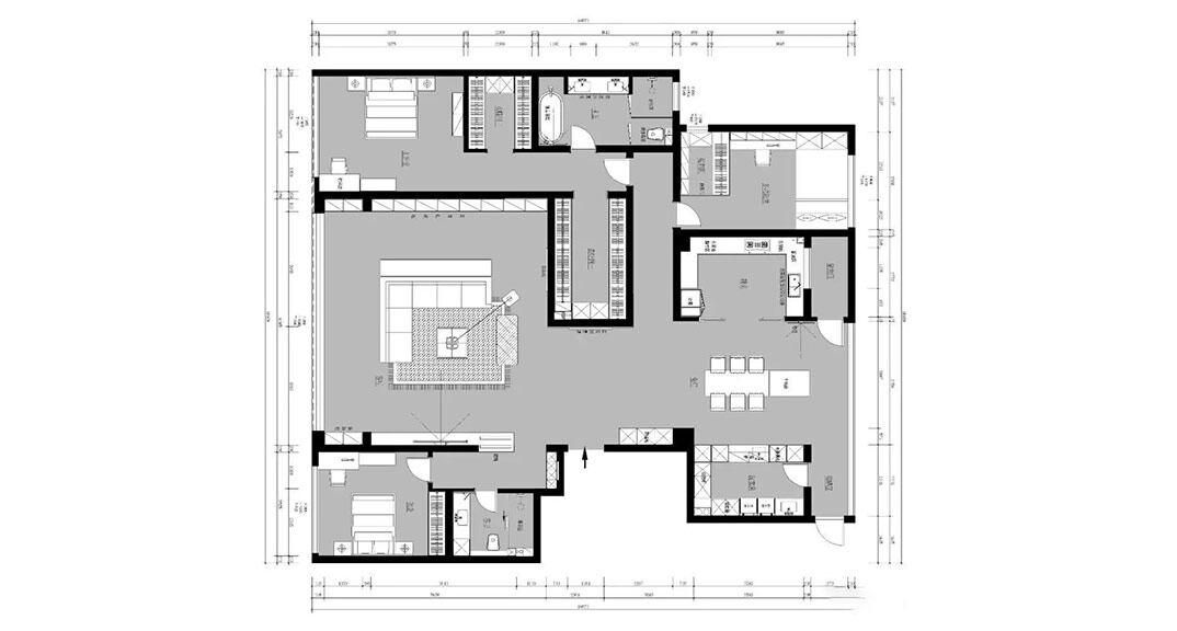 本項目是一個300平米的平層別墅空間,業(yè)主是一對年輕夫婦,年輕有為的他們思想前衛(wèi)、懂得享受,追求時尚生活。客廳是入戶的主要場所,是我們進入家門對家的初始印象,客廳在整個裝修中的重要性可見一斑。換一個角度來欣賞,空間裝飾多采用簡潔硬朗的直線條。直線裝飾在空間中的使用,不僅反映出現(xiàn)代人追求簡單生活的居住要求,更迎合了現(xiàn)代家具追求內斂、質樸的設計風格,使“輕奢”更加實用、更富現(xiàn)代感。