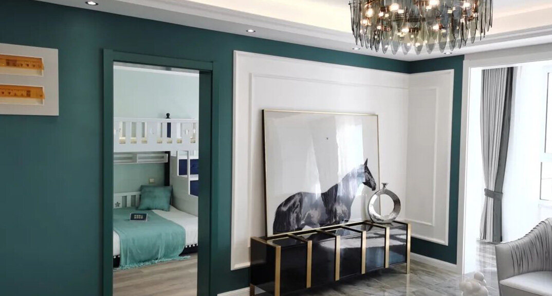 建筑讓我們接近一個原初而靜謐的世界。”這句話同樣適用于室內(nèi)設(shè)計。在家的社會議題下,在已有建筑基礎(chǔ)上,將室內(nèi)與外界光源條件、自然環(huán)境建構(gòu)聯(lián)系,構(gòu)筑出一個純粹而靜謐的空間,讓居者居身歸心,滿足其生活、休憩、娛樂以及更深層次的精神需求,電視背景墻在家裝中是顏值擔當?shù)拇嬖?,大面積的墨綠色,加入純白色作為視覺主導(dǎo),并輔以石膏線點綴、門套同色點綴,將這套精致樣板間布置出輕奢與個性的氛圍感,讓人一見傾心。