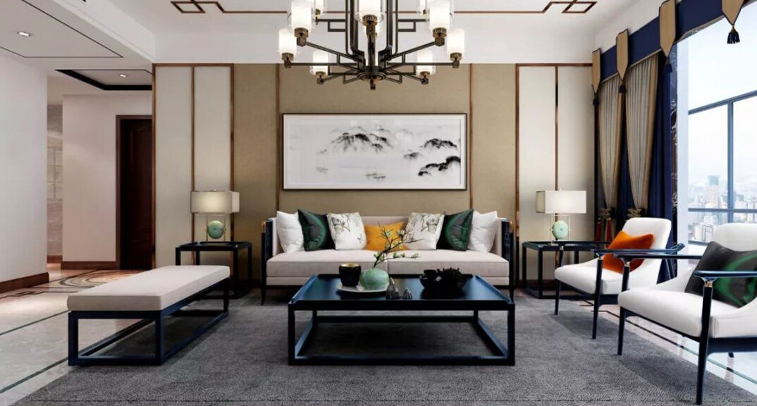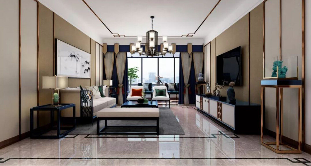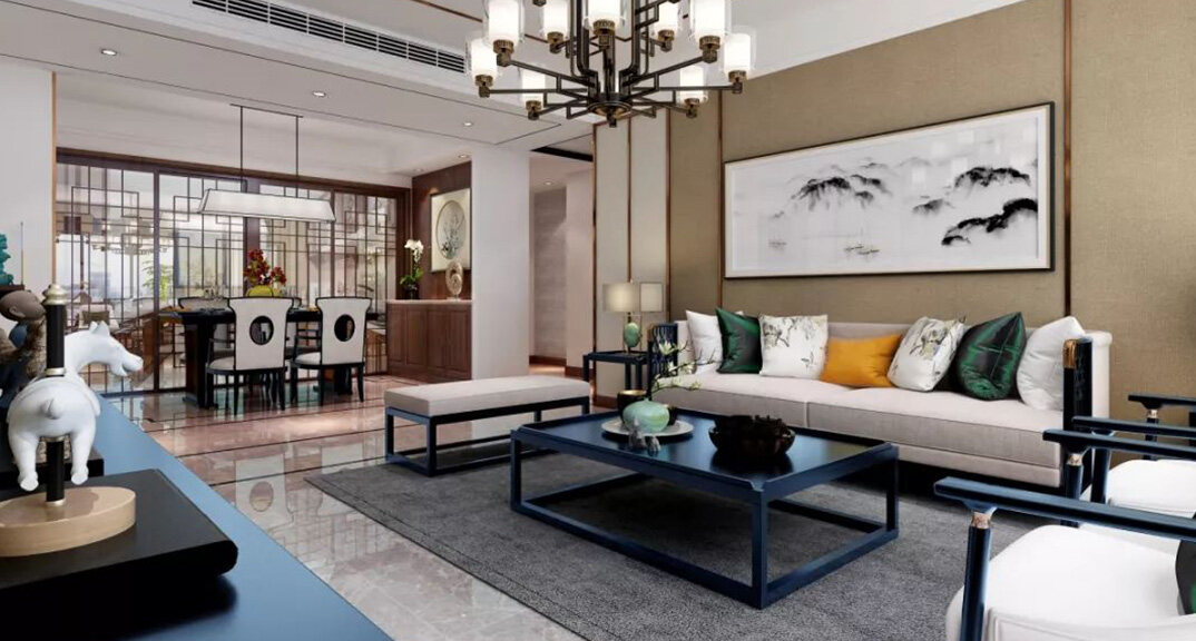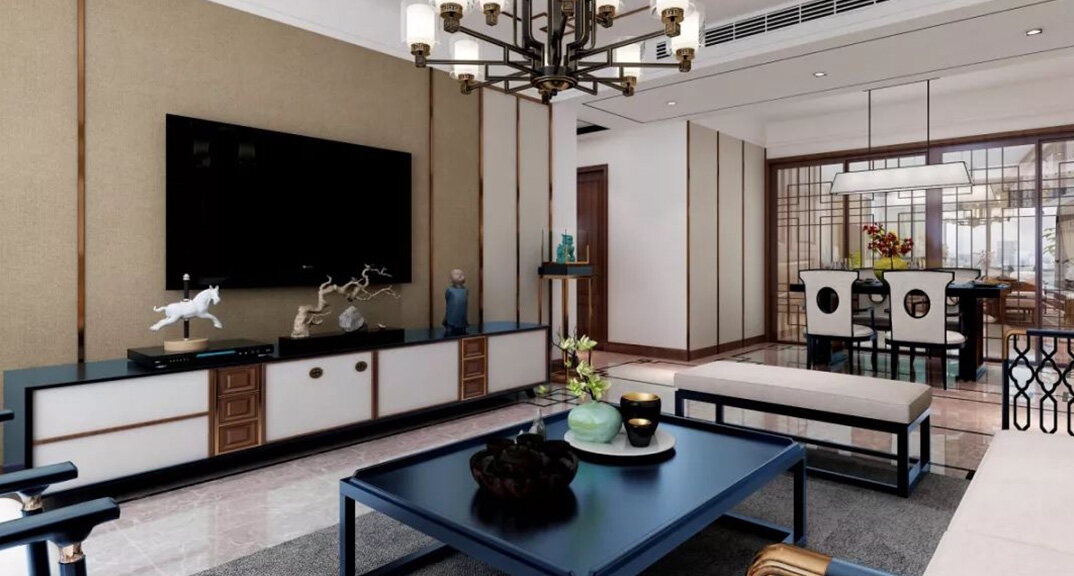 悅湖灣135㎡三室兩廳客廳新中式風(fēng)格裝修案例效果圖
