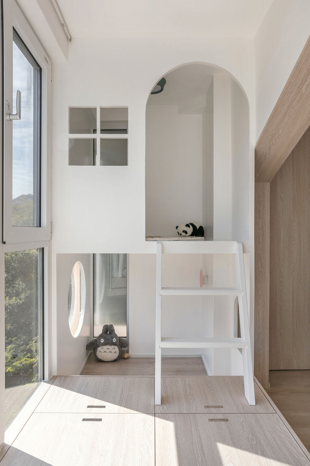 這是一套精心設(shè)計(jì)的親子空間。使用未經(jīng)精細(xì)加工的原木色配上淡淡的顏色,加上陽(yáng)臺(tái)飄窗孩子互動(dòng)的大臥榻設(shè)計(jì),簡(jiǎn)簡(jiǎn)單單的裝修,給人以溫馨舒適的感覺(jué)