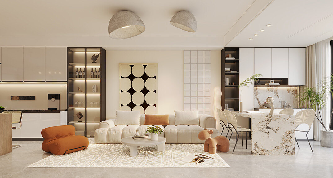 本案設(shè)計(jì)風(fēng)格為意式輕奢,拒絕了濃烈的色彩,以一種簡(jiǎn)單、純粹的設(shè)計(jì)語(yǔ)言,回歸生活的本質(zhì),留存給居住者更多生活想象的空間。 整體空間灰橙色、駝色、與淺暖灰色調(diào)展現(xiàn)輕奢低調(diào)的高級(jí)質(zhì)感,簡(jiǎn)約時(shí)尚的家具又增添了一份現(xiàn)代感,重新梳理了空間功能和尺寸,客廳陽(yáng)臺(tái)一體化設(shè)計(jì),最大限度引入自然光,高級(jí)灰搭配中性色系木飾面,打造一個(gè)舒適的高品質(zhì)空間。在空間設(shè)計(jì)與色彩配搭上,精準(zhǔn)地把控節(jié)奏,用設(shè)計(jì)表達(dá)空間的包容性,更多的是通過(guò)人性化思考,創(chuàng)造一個(gè)功能性完整的舒適生活空間。大塊的木飾面、金屬元素和燈 光的碰撞搭配,凸顯出強(qiáng)大張力,共同打造出意式輕奢腔調(diào)十足的時(shí)尚與質(zhì)感。