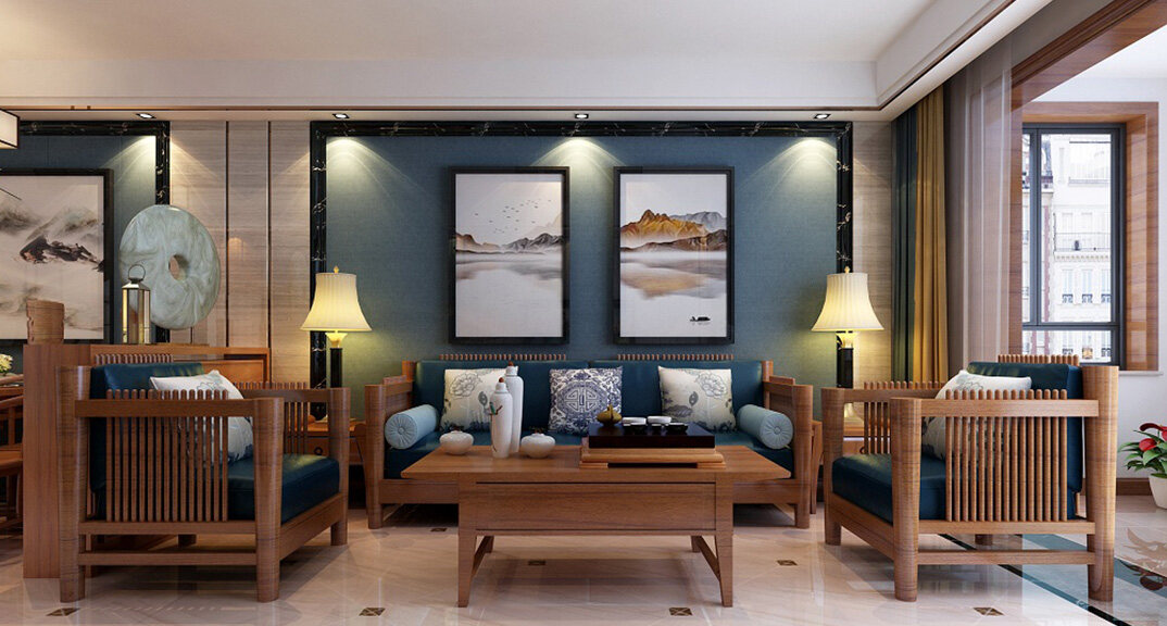 魯潤靜園156㎡三室兩廳客廳沙發(fā)簡約中式風(fēng)格裝修案例效果圖