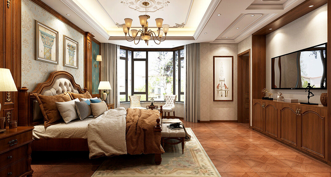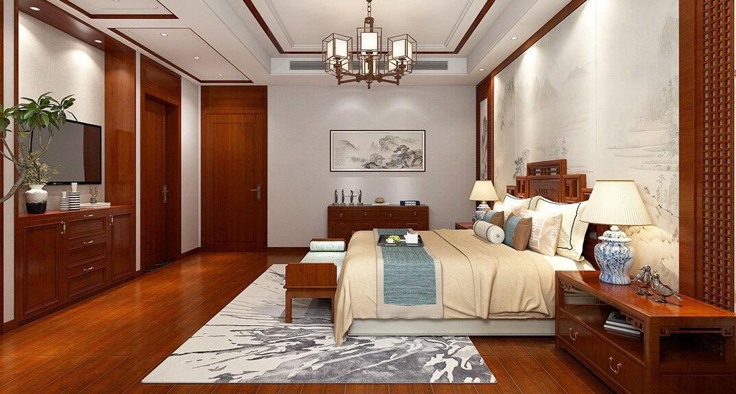 嶗山官邸1000㎡別墅三樓主臥新中式風(fēng)格裝修案例效果圖
