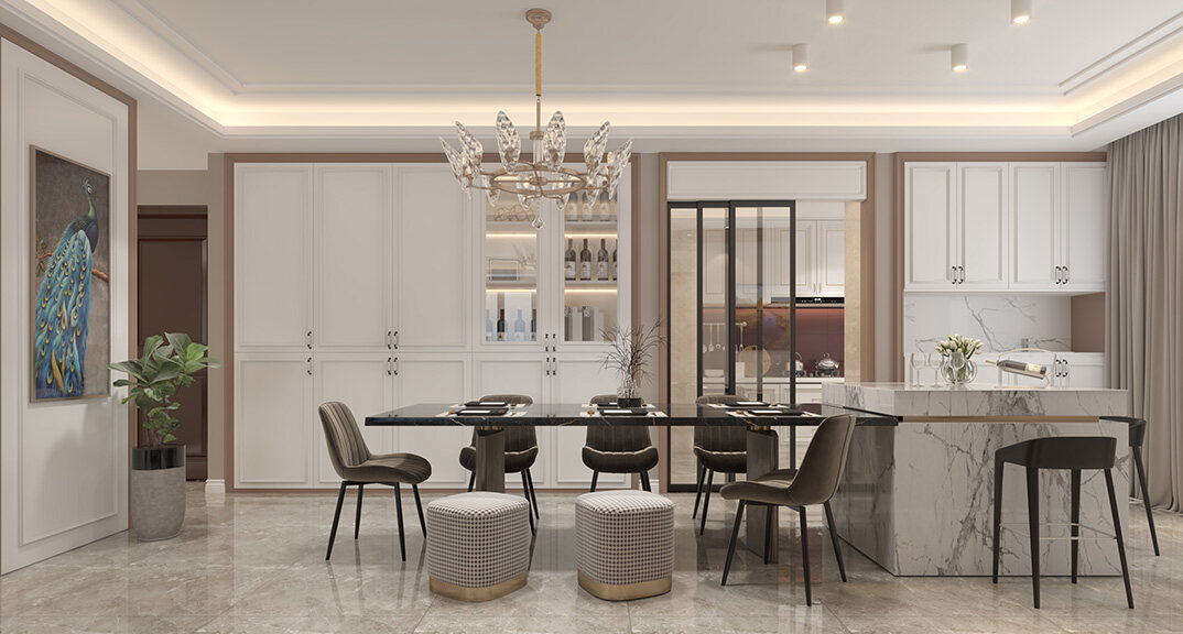 金地悅峰185㎡三室兩廳餐廳現(xiàn)代美式風(fēng)格裝修案例效果圖