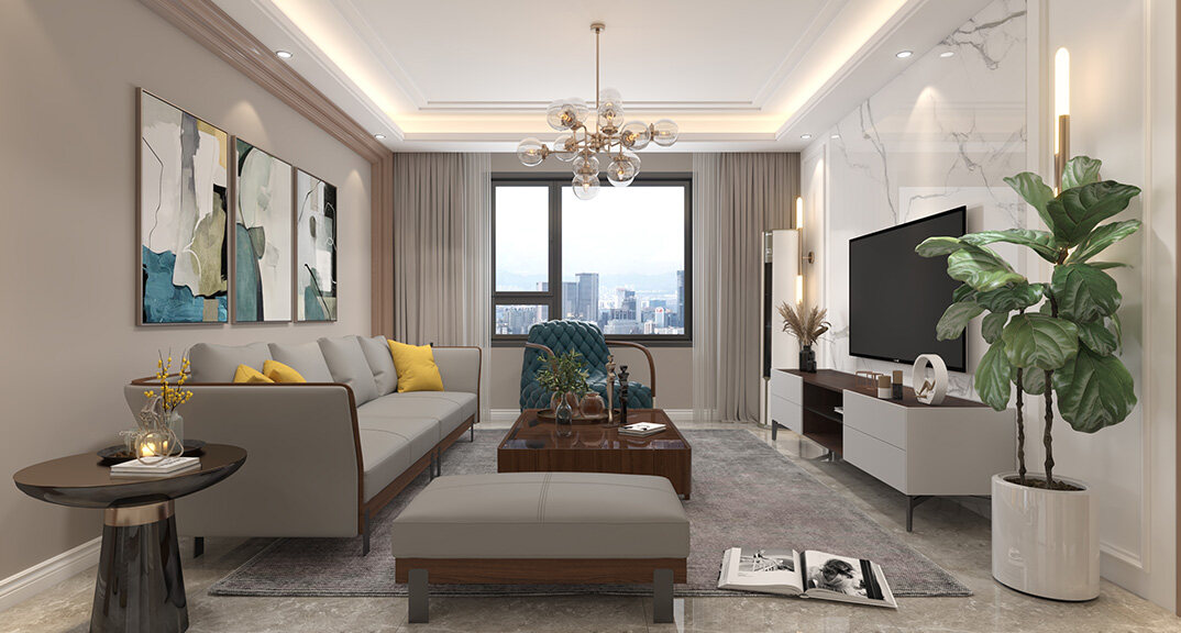 金地悅峰185㎡三室兩廳客廳現(xiàn)代美式風(fēng)格裝修案例效果圖
