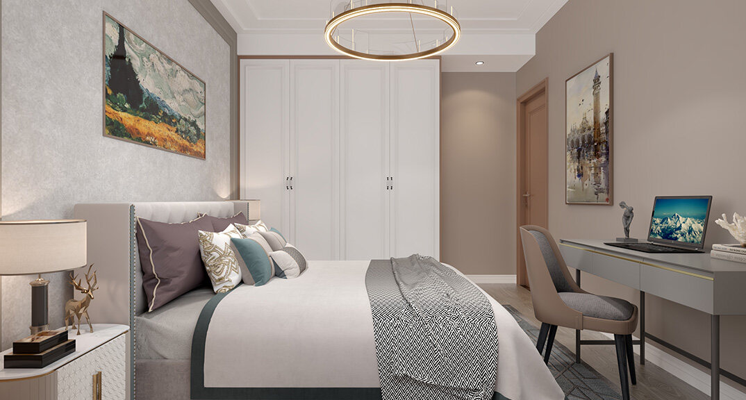 金地悅峰185㎡三室兩廳臥室現(xiàn)代美式風(fēng)格裝修案例效果圖